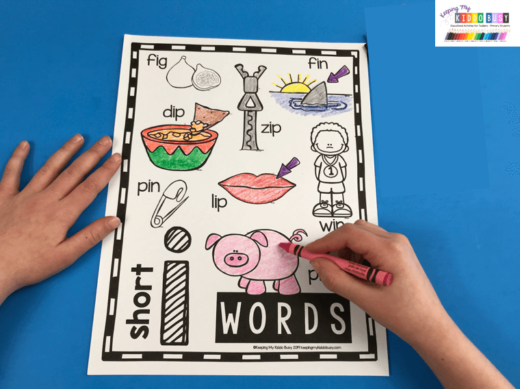 When they are done coloring, I have students flip over their charts and draw and write their own short vowel words.