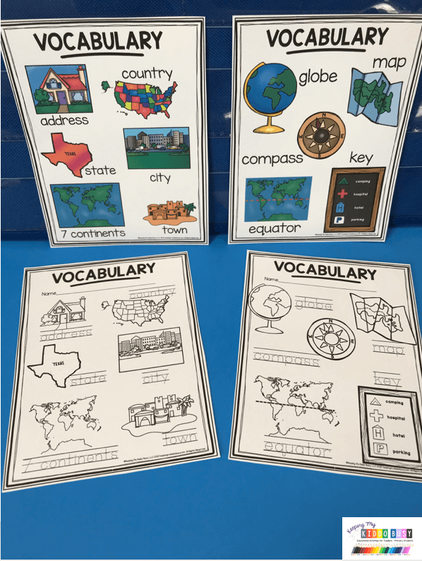 Chances are they have seen a map and globe before, and we review our vocabulary charts from last week.