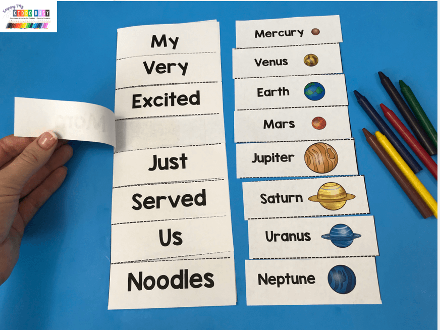 I teach them the saying, “My Very Excited Mother Just Served Us Noodles” to help them remember the order of the planets.