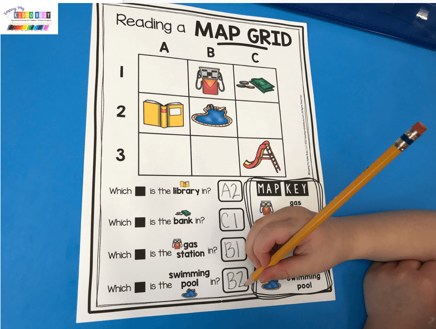 The next step gets a little bit harder and I have students actually write answers to a couple questions like, “What is located in square A1?”