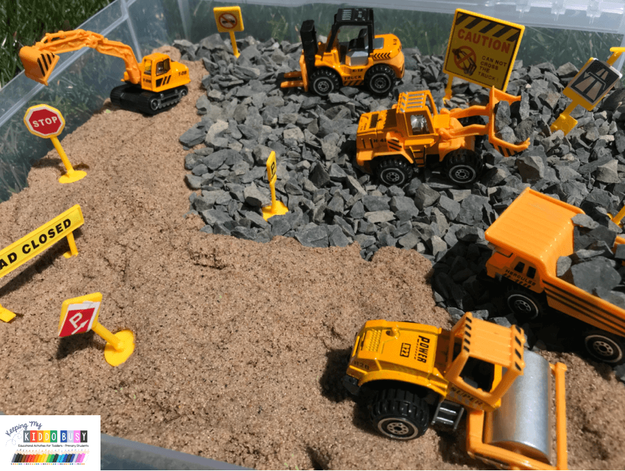 If my kiddos are working on learning their letters or numbers, I add plastic alphabet pieces for the dump trucks to pick up and move around.