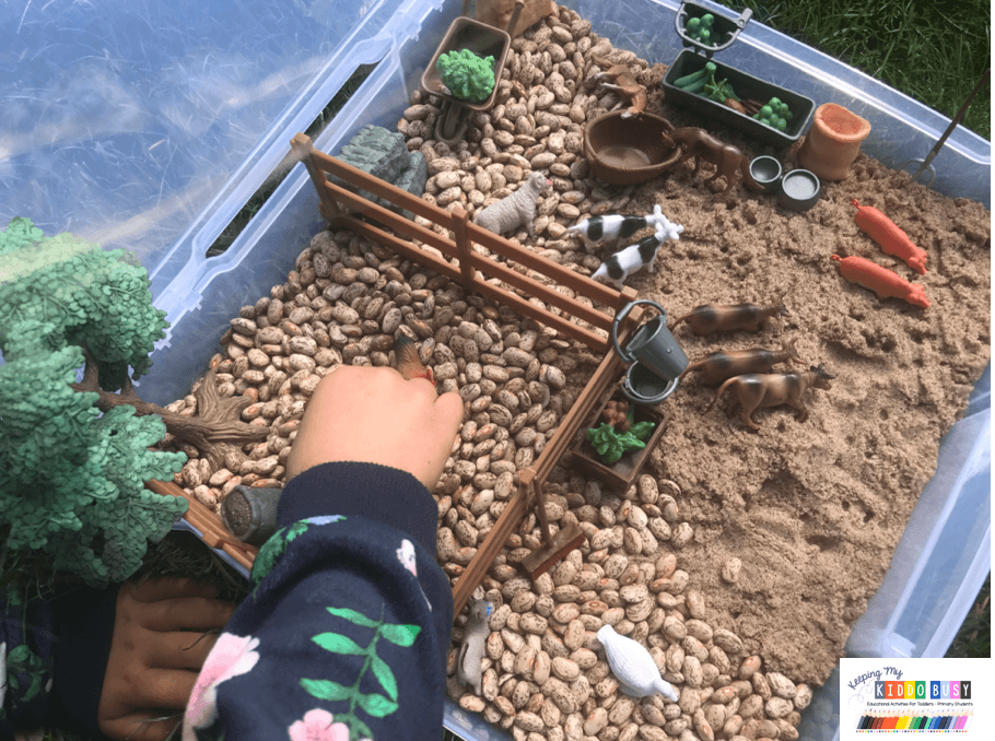 I love to add things to this bin to switch it up. The kids love adding the beans to the bins and mini wheelbarrow, and make pens and feed the animals.
