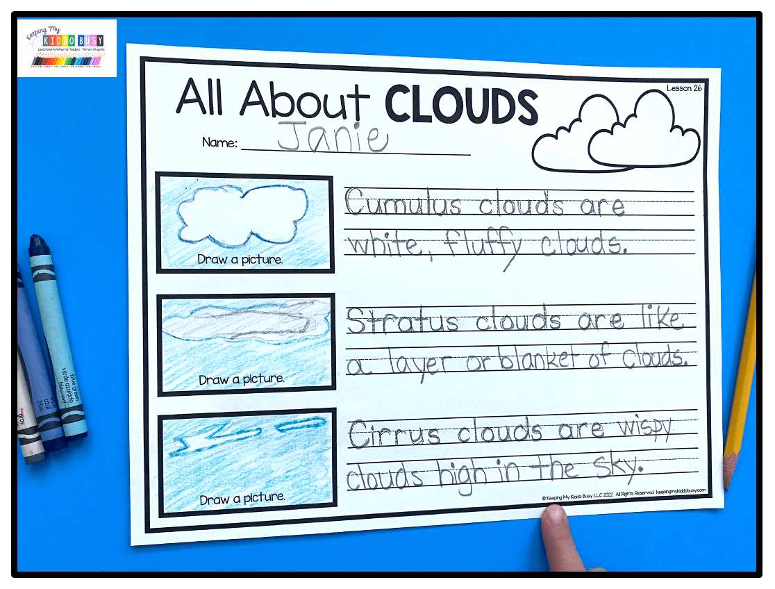I show these slides and students draw and fill out the All About Clouds activity page.