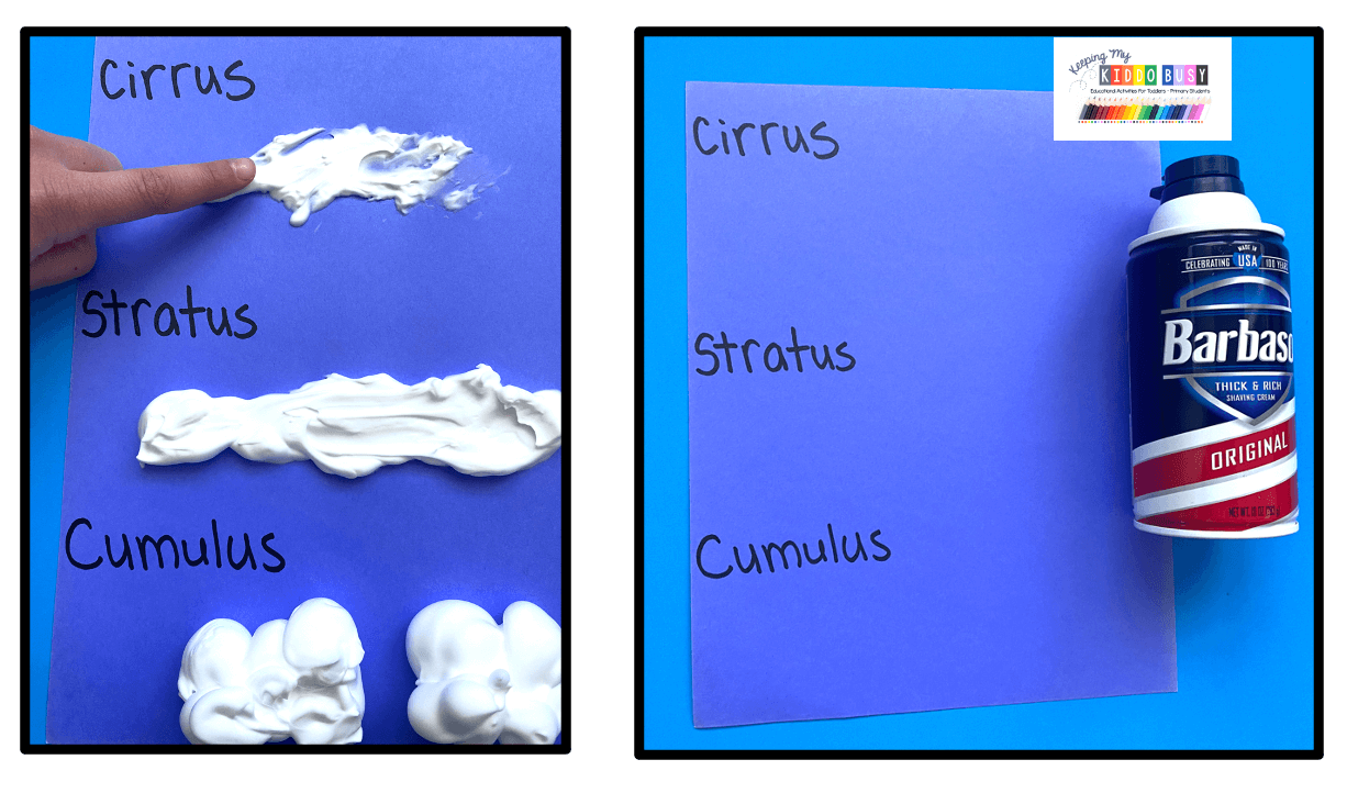If you want the clouds to “stick and stay” for a couple days, you can add white glue to the shaving cream so you can display their clouds (they won’t stay the correct form for very long though.)