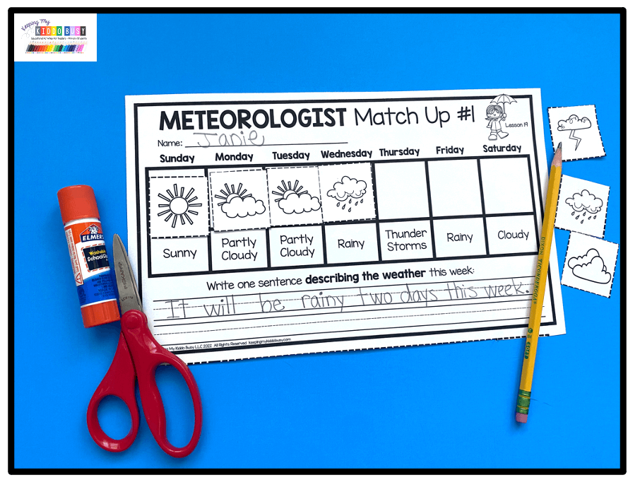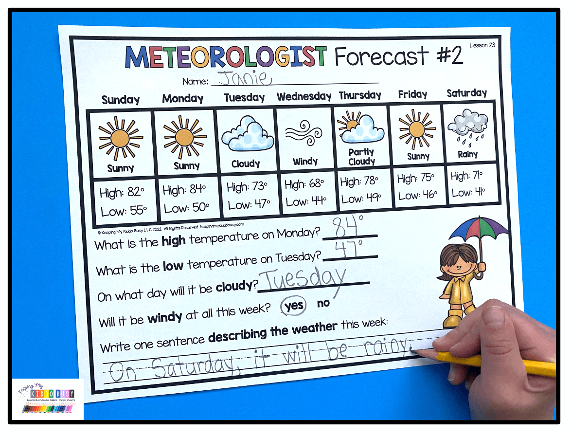 Sing the weather song, add to the weather graph each day, create our own seven day forecast and more!