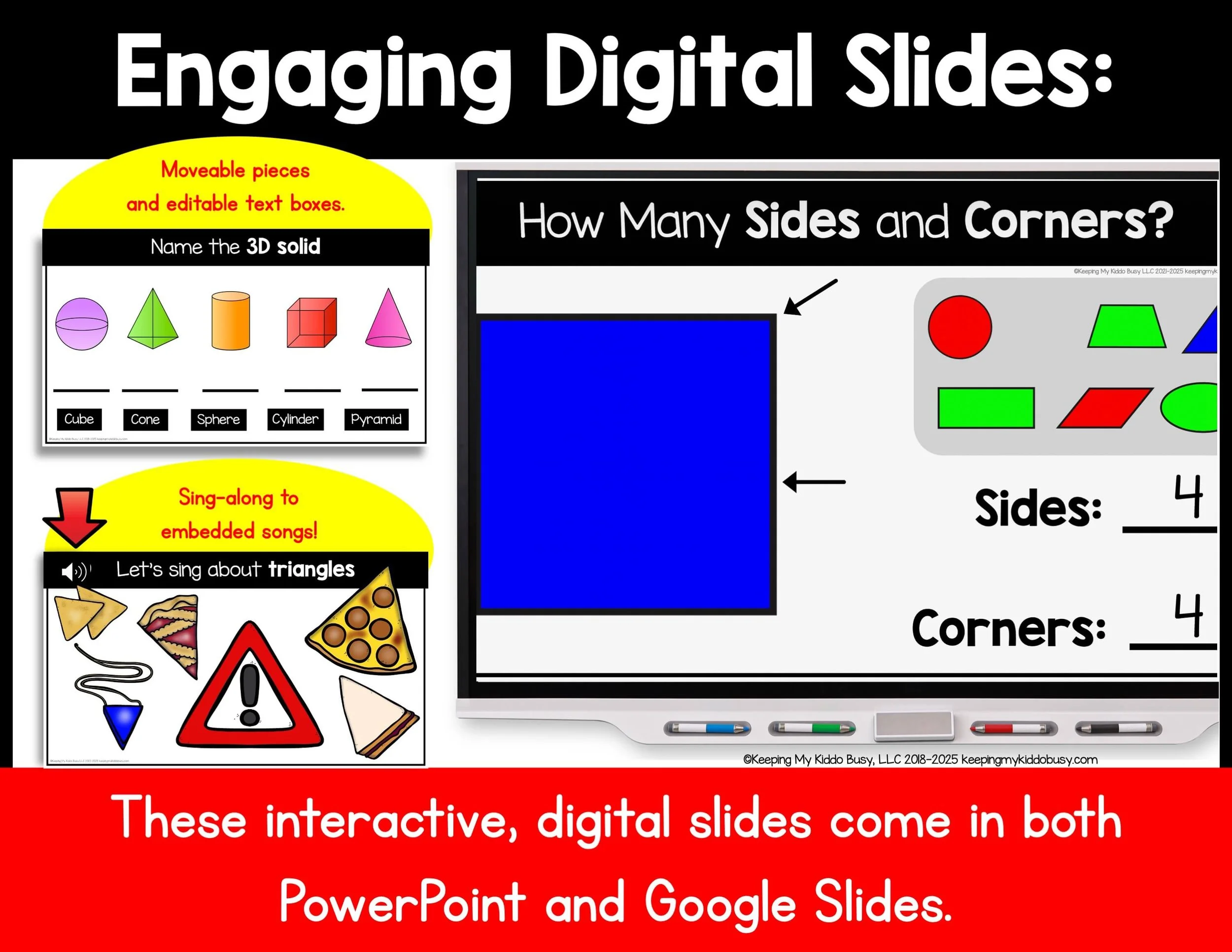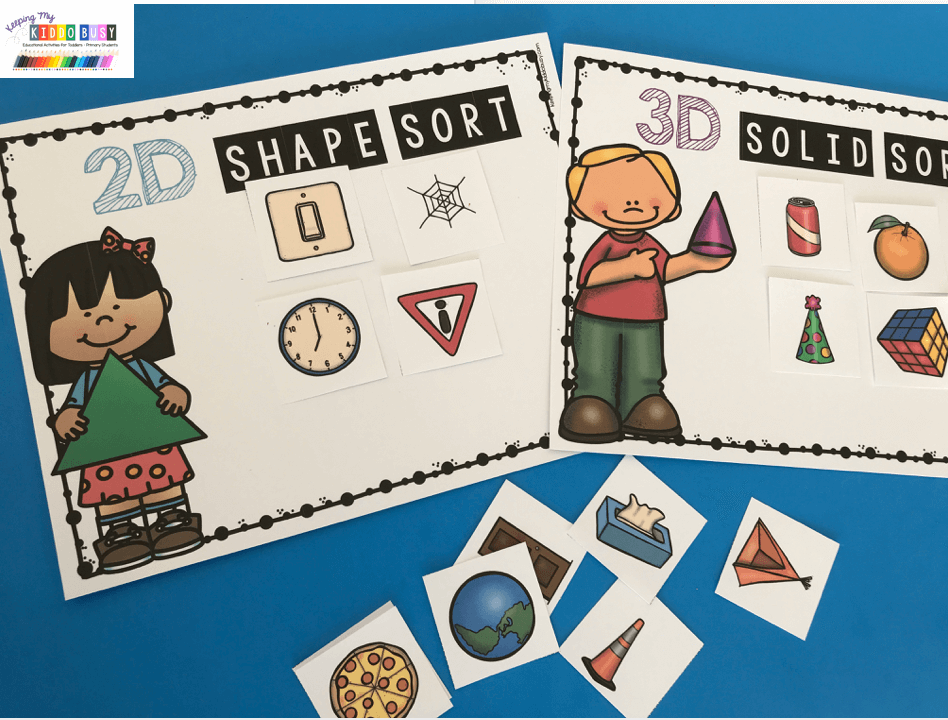 These worksheets practice the 2D shape and 3D solid names, vocabulary such as corners, sides, vertices, etc.